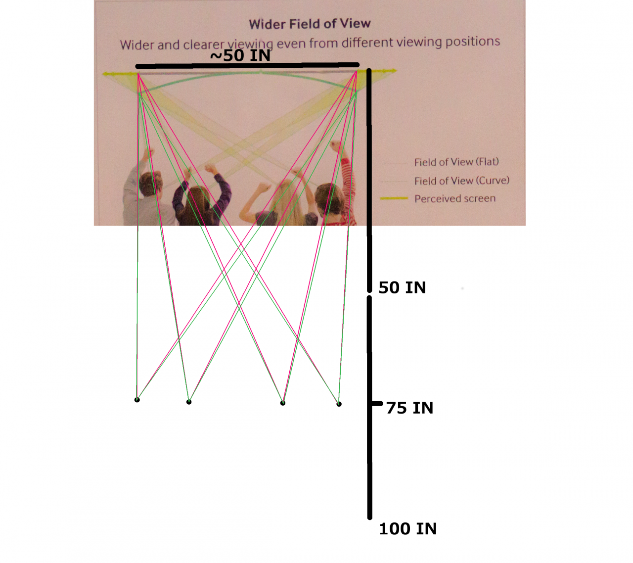 Funnily enough, these diagrams show that, for certain setups, there actually is a point to the Samsung TV that can convert from flat to curved. When you are watching by yourself and can pull up a chair a few feet from the screen, go curve. When there are other people around whom you don’t want to sit practically in your lap, go flat.