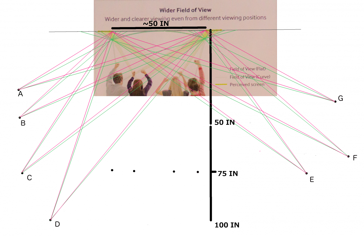 If you started to fan viewers out beyond the edges of the TV, the picture for them would be distorted. Beyond a certain point, the image cuts off at one edge. These wide-seated viewers also don’t get the field-of-view benefits, as their envelope just shifts to one side or the other. Persons A and B can’t see the far left side of the screen, and G and F can’t see the right side. They would be able to see a flat screen TV, though the picture would be distorted. Even person D sitting at a slight angle loses all the “widened field of view” benefits of the curve.